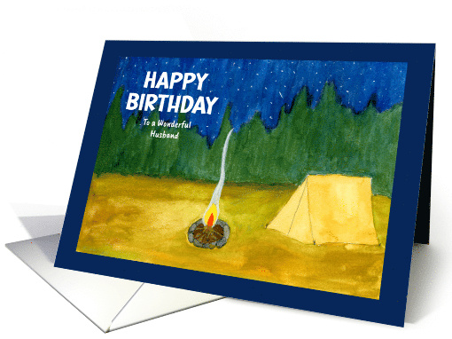 A cozy, nature-filled birthday card for your wonderful Husband! A warm campfire, a comfortable tent, and a night sky bursting with stars create a scene of adventure and tranquility.