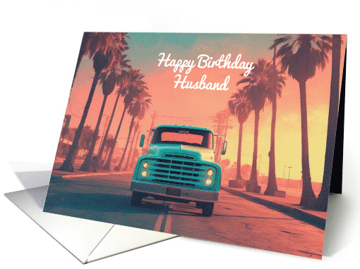 This heartfelt and stylish birthday card is a perfect way to celebrate your husband's special day with a unique and adventurous touch. The design showcases a vintage turquoise pickup truck centered on an open road lined with tall, elegant palm trees. The warm hues of a breathtaking sunset—blending shades of pink, orange, and teal—create a dreamy, nostalgic atmosphere, evoking the romance of road trips and endless summer evenings. The words "Happy Birthday Husband" are displayed in a flowing white script, standing out against the vivid sky. The art style combines realism with a digitally enhanced pop-art aesthetic, reminiscent of classic Americana and retro travel posters. This card is ideal for a husband who loves classic cars, the open road, or simply a bold and meaningful design. Whether he’s a car enthusiast or an adventurer at heart, this card delivers a stylish and heartfelt message he’ll truly appreciate.
