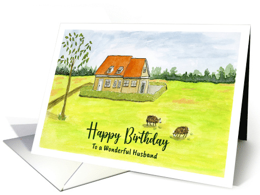 Send your amazing Husband this sweet card to wish him a happy birthday on this important day. This card was made using a watercolor illustration of a little rural setting with grazing animals.