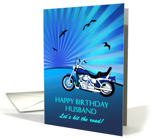 Happy birthday husband card with a motorbike. A perfect card for a biker. A blue motorbike with a stylized sunset and flying birds. Any bike enthusiast will love to get a card like this.