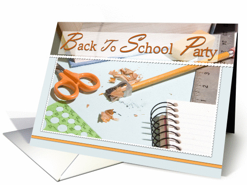Photographic Back to School Party invitation. Depicts school supplies such as book, paper, scissors, pencil, pencil sharpener, ruler, and stencil. Appropriate for any type of study group, parent groups, school social, or just some adult fun.