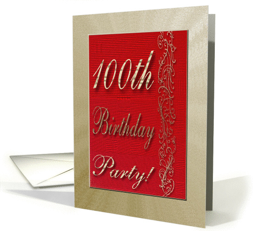 Invitation, 100th Birthday Party, Red and Gold Design. Inside Verse: Please join us as we celebrate 's 100th Birthday. Date: Time: Place: Please kindly respond by . Requests are welcome! Request a Custom Designed Card at NO additional Cost. Use the Icon to Contact the Artist. The inside text of all cards can be changed by you.