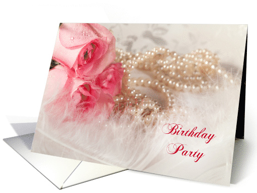 A stunning birthday party invitation featuring pink roses, pearls, and feathers. Invite friends and family to your party with a card that is truly feminine.
