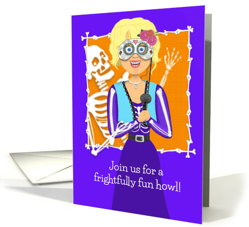 In this Halloween invitation, a woman in skeleton costume and a “Day of the Dead” mask is holding a microphone. She has a big grin, and bright blue eyes shining through the mask eye openings. Behind her is a Skeleton ghost, smiling and waving to the viewer. The background behind them is an orange box, surrounded by tiny, white bones. Behind the box, the surrounding area is deep purple. The text is white.