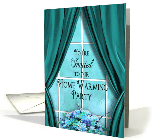 Housewarming Invitation, Window and Teal Curtains with Floral Bouquet