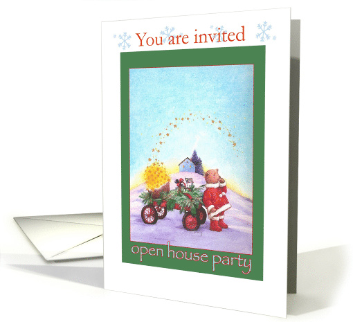Open house party invitation that exudes fun & happiness, classic typography with detail illustration of teddy bear in red outfit bearing a wagon full of twinkling stars, magical winter illustration by judtih cheng
