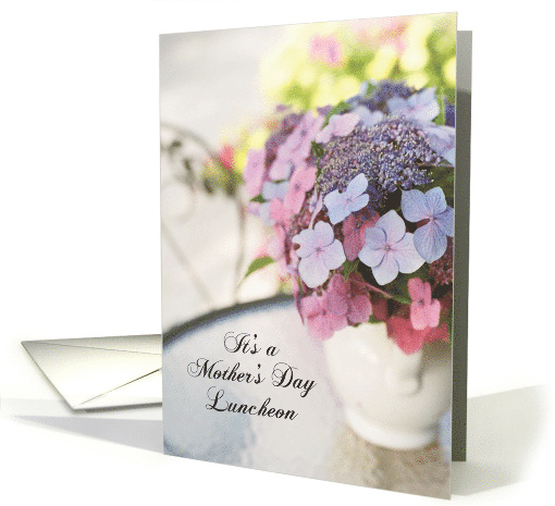 A Mother's Day Luncheon Invitation showing pretty flowers in a white pitcher vase. The flowers are sitting on a table, just waiting for your guests!