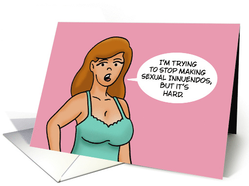 Humorous Adult/Sexy Love & Romance Card with a cartoon woman on a pink background. The words say: I'm trying to stop making sexual innuendos, but it's hard. Inside says: So hard!