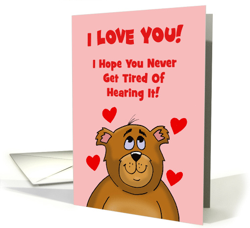 Love/Romance card with a cartoon bear with hearts on a pink background. The words say: I love You! I hope you never get tired of hearing it! Inside says: Because I never get tired of saying it!