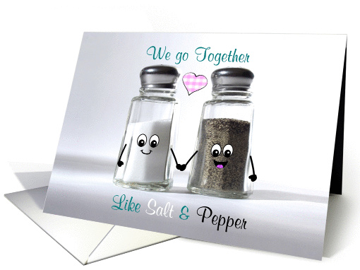 This card features a cute, happy couple of salt and pepper shakers holding hands. The caption reads: We go together like salt and pepper. This romantic card is good for any couple and especially for mixed race couples who like fun, sweet, romantic cartoons. The inside reads: We make a great team!