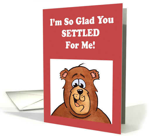 Humorous Love/Romance Card with a cartoon bear in a white square, on a red background. The words say: I'm so glad you settled for me! Inside says: I Love You!