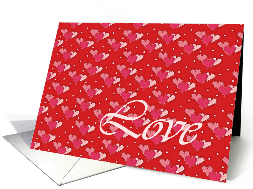 This digital image shows rows of three hearts and small dots on a red background. The card has this image and the expression: "Love"