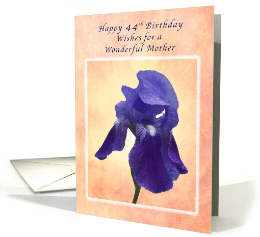 A striking purple iris against a stucco background of warm pastel colors makes for a very eye catching and inviting image for this birthday card designed for your wonderful Mother. This is a simple yet beautiful card to give celebrating her 44th Birthday.