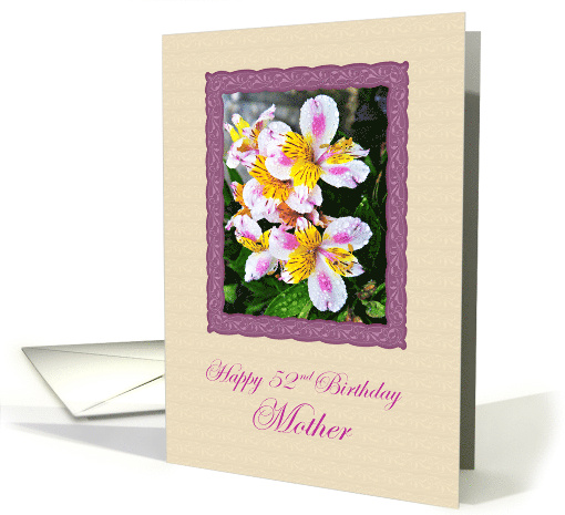 52nd birthday card for a mother. A beautiful framed picture of alstroemeria lilies covered in raindrops. Delicate flowers caught in a shower of rain. A lovely floral card that mother will love.