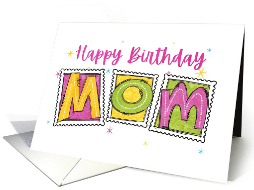 Bold yellow, green and pink letters spell out "Mom" on postage stamp shapes, detailed with scribbles and swirls on this bright birthday card for Mom.