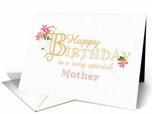 An elegant, minimalist birthday card for your mother with gold-effect lettering and pinkish-red Clematis flowers and their long, rambling stems and leaves. The front cover greeting is, 'Happy Birthday to a very special Mother' in gold-effect lettering with an outsize letter 'B' entwined with a cluster of Clematis flowers and its long shoots and leaves. The word, 'Mother' is in a pinkish-red to match the flowers, all on a lightly textured white background. You can easily edit the inside message to suit your needs or delete it altogether if you prefer a 'Blank Inside' birthday card.