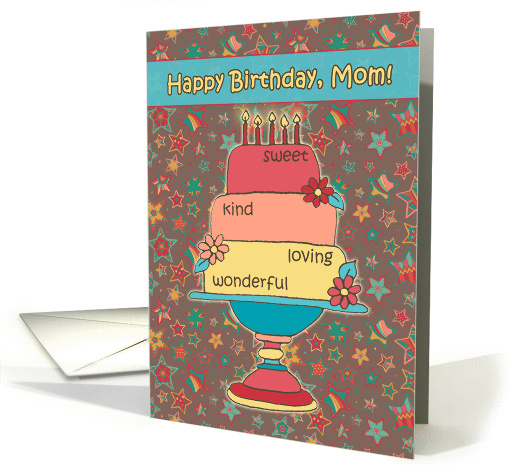 A hand drawn illustration of a pretty cake in colors of melon, yellow, teal & peach, decorated with daisies & leaves & the words: sweet, kind, loving, wonderful. Text on a banner reads: Happy Birthday, Mom! The background is covered with a cute, multi-colored star pattern on soft grey / brown.
