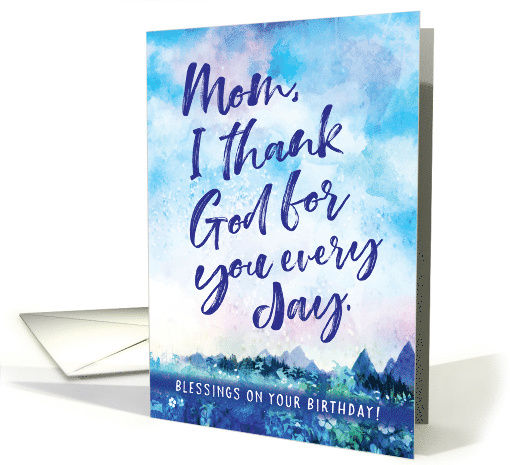 Wish mom a happy birthday with this brush script watercolor design, featuring the message, "Mom, I thank God for you every day. Blessings on your birthday!" Background is watercolor painted texture with flowers. Inside can be customized with your own message.