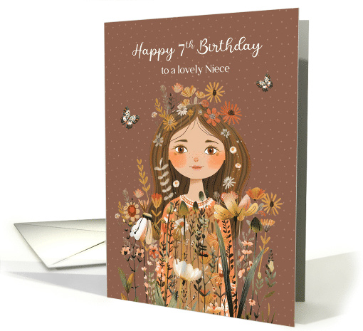 Give your niece a whimsical 7th birthday greeting with this sweet girl standing in a bunch of flowers with butterflies flitting overhead. Lovely earth tones in a popular mocha color with oranges and yellow compliment this design.