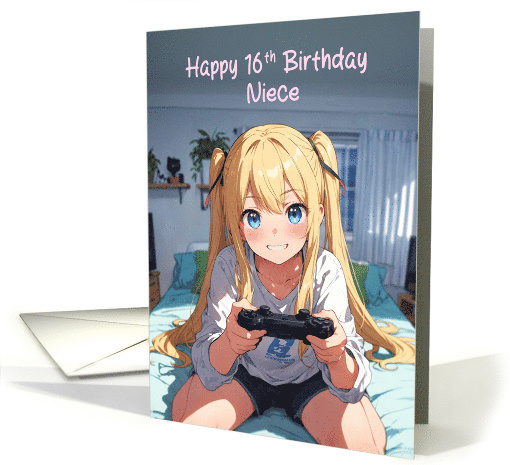 Sweet 16—a birthday to remember! Celebrate your niece’s special milestone with this vibrant anime-style card. The artwork shows a confident blonde teen seated cross-legged on her bed, gaming controller in hand, her bright blue eyes glowing with happiness. Her playful twin ponytails and casual outfit reflect her fun, approachable personality, while her softly lit bedroom—featuring leafy plants, floating shelves, and neatly made bedding—adds a cosy, inviting touch. A soft pink “Happy 16th Birthday” message crowns the design, adding a festive sparkle. Whether she’s dreaming about the future or enjoying her favourite hobbies, this card is a heartfelt reminder of how cherished she is.