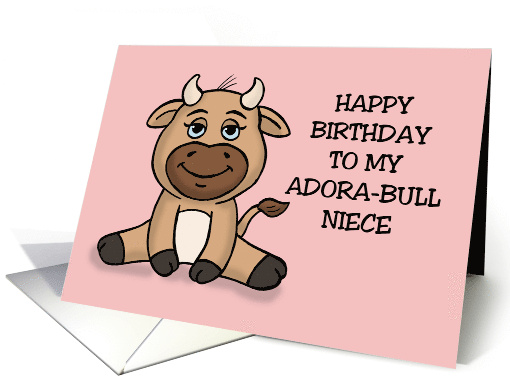 Cute Birthday Card For a Niece, with a cute cartoon bull on a pink background. The words say: Happy Birthday to my adora-bull niece! (a pun for adorable) Inside says: Have a wonderful day!
