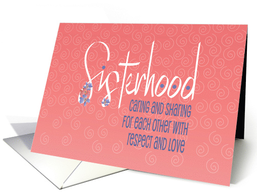"Sisterhood" is hand lettered in beautifully elegant white calligraphy, across the top of this lovely melon-colored card. The lettering is a sleek modern vertical italic, with some of the letters filled with round blue dots. Both of the letters of "S" have descenders that are filled with blue and melon flowers, enhancing the word. Additional wording below and to the right says "Caring and Sharing For Each Other with Respect and Love". The melon background is covered with a soft white pattern of white swirls. The inside wording of the card says "Celebrating the anniversary of our sisterhood friendship. Thanks for being such a wonderful friend, who is like a sister to me."