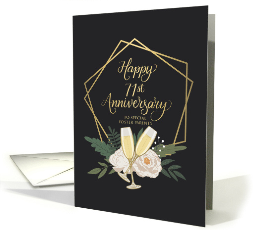 Send your wedding anniversary wishes with this lovely modern boho card illustrated with a faux gold geometric frame decorated with wine glasses, peonies, berries and leaves with the elegant faux gold hand lettered words 'Happy 71st Anniversary' by Ness to special foster parents. © Ness Nordberg