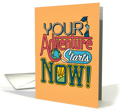 This college graduation graphic features custom lettering reading, your adventure starts here with graphics of a graduate tossing cap in air, the Earth and a sunny sunrise.