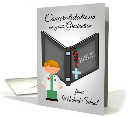 Congratulate any male on his graduation from medical school with a religious card featuring a doctor with a stethoscope around his neck in front of a bible with a blue cross hanging on the end of a red rosary. The background is gradient with black, fancy text. Inside like all Greeting Card Universe cards can be personalized by you if you wish to give it your own personal touch. Design by Laurie Schneider, elements by Scrappin Doodles, Digi-Doodle Doo