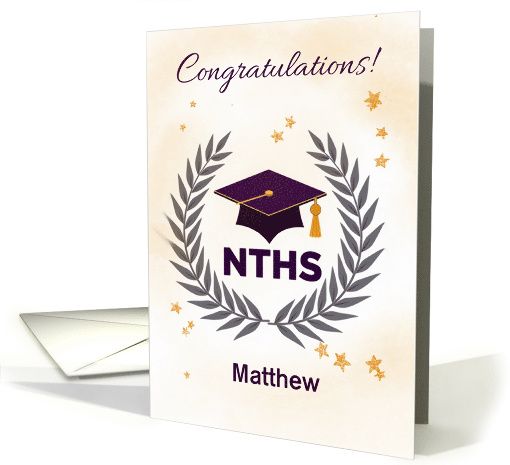 A celebratory design featuring a graduation cap framed by a laurel wreath with purple and gold tones, accented by golden stars, created to honor induction into the National Technical Honor Society. The soft background wash gives the design a polished, ceremonial feel, while the customizable name option on the front makes it a truly personal way to recognize a student’s hard work, dedication, and achievement.
