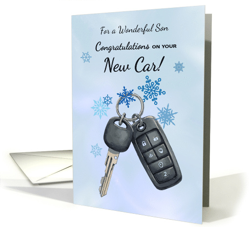 Congratulate your son on his new set of car keys with this frosty winter-themed card. A pair of illustrated keys accented by blue snowflakes symbolizes new beginnings and exciting milestones. Perfect for celebrating his first vehicle, a holiday gift car, or simply the thrill of his latest ride during the snowy season.