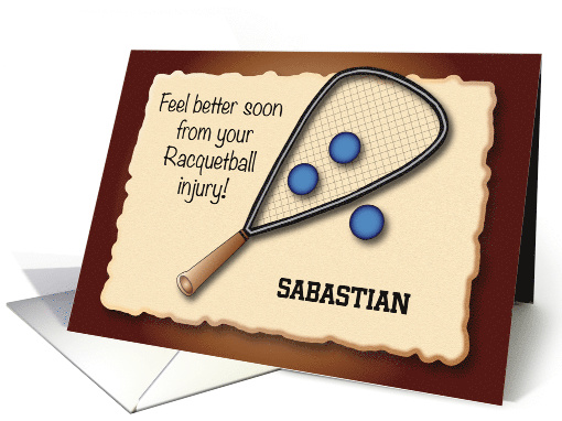 The cover of this get well card for a racquetball player features a racquet, 3 blue balls, and a tan and brown background. The headline is black. There's room on the bottom right corner for the personal name.The inside message may be changed, if you wish. ©Gail Pepin