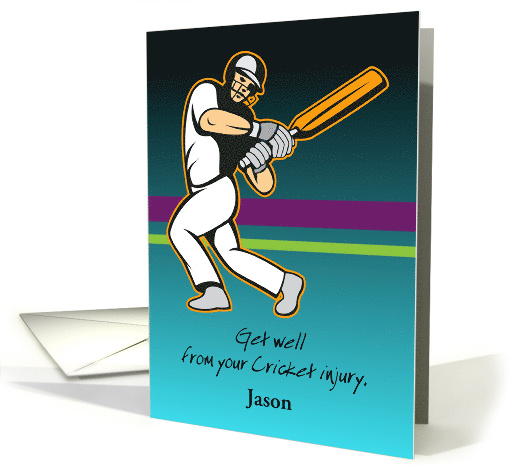 When a cricket player gets hurt, send a custom name get well card. He won't get another one like it! The cover features a cricket player (graphic courtesy of The Graphics Factory) on a contrasting background of teal, light green, purple, and black. There's room for the name underneath the black headline. The inside message may be changed, if you wish. ©Gail Pepin