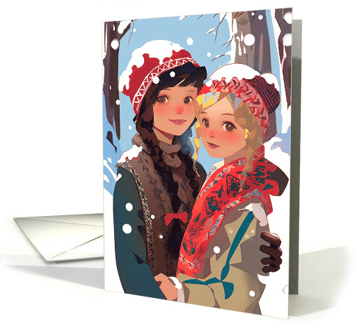 A romantic winter greeting card featuring two teenage girls outdoors, hugging and looking into the camera. One is brunette, the other blonde, both wearing cozy knitted hats. Snowflakes are gently falling, creating a magical atmosphere. The illustration captures warmth, tenderness, and the joy of being in love on a snowy day. Perfect as a card for couples, friendship, or anyone who cherishes sweet winter moments.