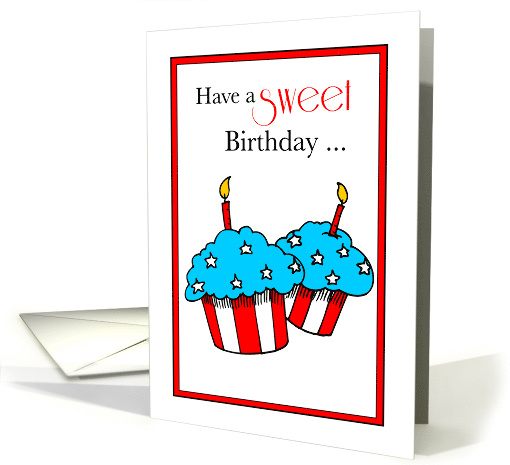 A very patriotic Birthday card for a woman or man who loves the United States. Two yummy cupcakes with candles in red, white and blue colors. This is the American card you need for your good wishes.
