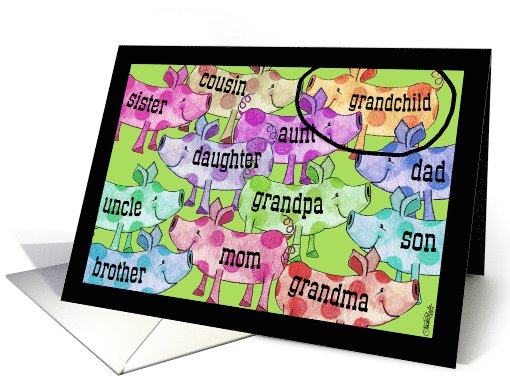 ©Christie Black. A collage of colorful spotted pigs with family relations written on each pig lets them know just how imPORKtant they are! Find other versions of this card at www.greetingcarduniverse.com/christieblack
