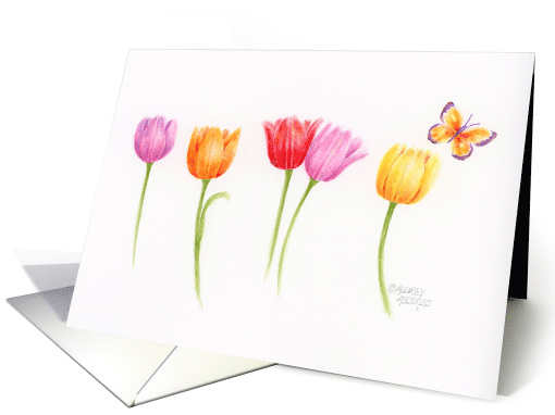Delightful rainbow of colorful tulips dance in the breeze with a happy butterfly with an uplifting message for a special birthday celebration! Beautifully bright flora sends wishes of God's blessings. Inside Verse:May God bless you on this special day and always be with you. Happy Birthday! Original watercolor artwork and design by Audrey Ascenzo. ❤️