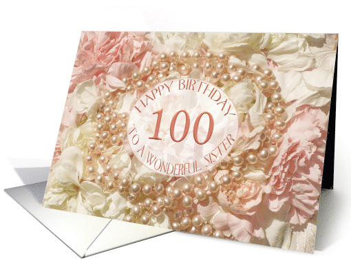100th birthday greetings or sister with pearls and petals. A beautiful way to wish a happy birthday. Pink pearls lie an a bed of pink and white petals. A very feminine card for a woman.