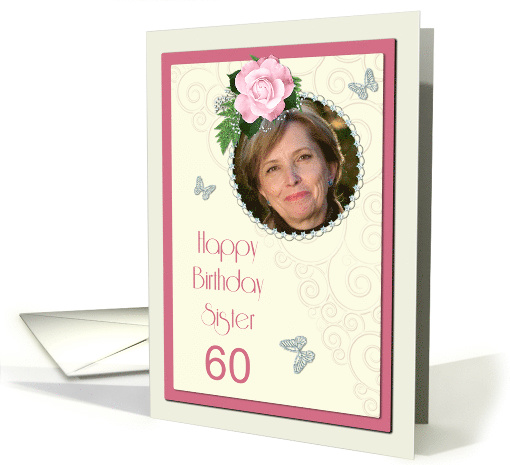 Add your photo to personalize a unique and stunning birthday card for your sister's 60th birthday. Place your picture inside the diamond encrusted frame. A beautiful pink rose and jewelled butterfly completes the look. A very stylish and modern birthday card. All parts are printed.