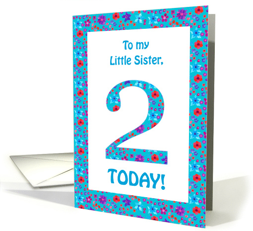 A very pretty 2nd birthday card for a little sister, with a ditsy floral pattern making up the number 1 and the border. The background colour of the pattern is turquoise and the tiny flowers are red, purple, pale blue and pink. The front cover greeting, also in turquoise, on the white background, is, 'To my Little Sister, 2 TODAY!'. You can personalise the inside message or delete it if you wish.