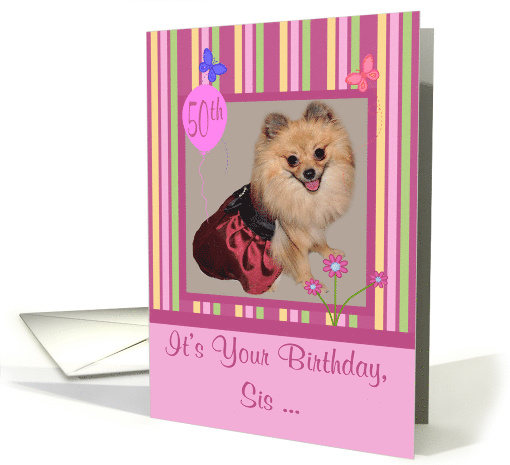 Wish your sister a Happy 50th Birthday with an adorable Pomeranian, Ava smiling wearing a pretty dress. The background is stripped with butterflies, a flower, a balloon, and magenta text. Poms used to pull sleds and herd animals.