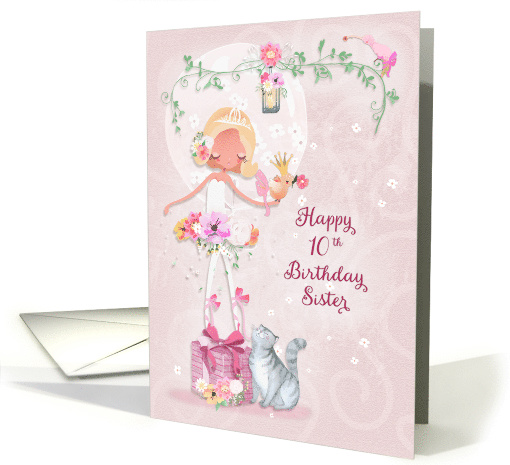 Send Happy 10th Birthday Sister greetings with this design featuring a cute ballerina dancing atop a birthday present joined by a cat and two birds. The background has swirls and floating white flowers.