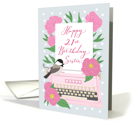 Happy 21st Birthday Sister with Typewriter, Chickadee Bird and Flowers