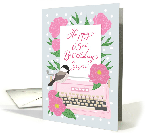A pink vintage typewriter surrounded by flowers and leaves with a chickadee bird perched on the typewriter. A piece of paper from the typewriter has the handwritten words Happy 65th Birthday Sister. A lovely birthday card for your sister turning 65!