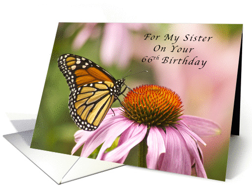 A lovely image of a monarch butterfly sitting on a light purple cone flower makes a beautiful birthday card. This is ideal for giving to your Sister on her 66th birthday.