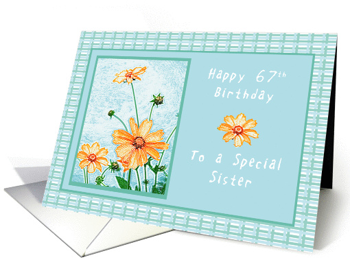 A beautiful orange flowers with a pastel blue and green gingham pattern backdrop. A card your sister is sure to enjoy on her 67th birthday.