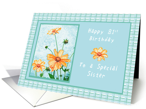 A beautiful orange flowers with a pastel blue and green gingham pattern backdrop. A card your sister is sure to enjoy on her 81st birthday.