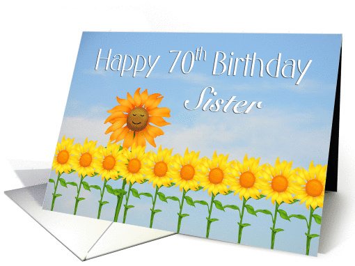This is for a bright and cheerful card for Sister's 70th birthday featuring a sunny sky background with a few slight clouds and a row of sunflowers with one large orange sunflower standing above the rest with a smile on it's face. This card and any can be customized to fit your specific needs. Just send me a message and within 24 hours I will have your card ready to purchase. Some original artwork@delightfuldoodles.