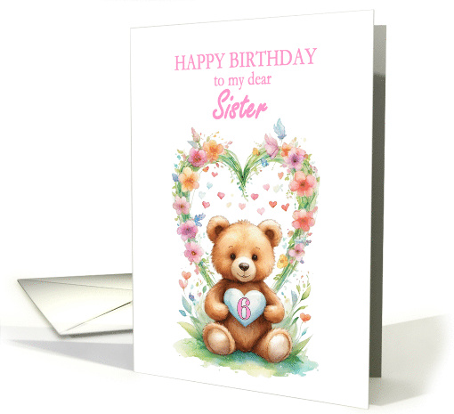Send birthday wishes to your sister on her sixth birthday in the cutest way possible with this lovely card. A teddy bear, in front of a bunch of colorful flowers, presents a heart showcasing the age of 6. Make their birthday unforgettable with this charming card. A 6th birthday card for a sister.