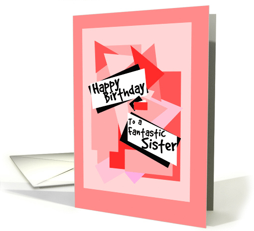 Happy Birthday to a fantastic Sister. This is a bold simple fun design, lots of pink, rectangles,triangles,squares in different pinks.